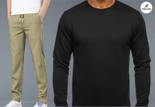 4 WAY STRETCHABLE LYCRA CAMEL TRACKPANTS AND FLEECE BLACK SWEATSHIRTS COMBO