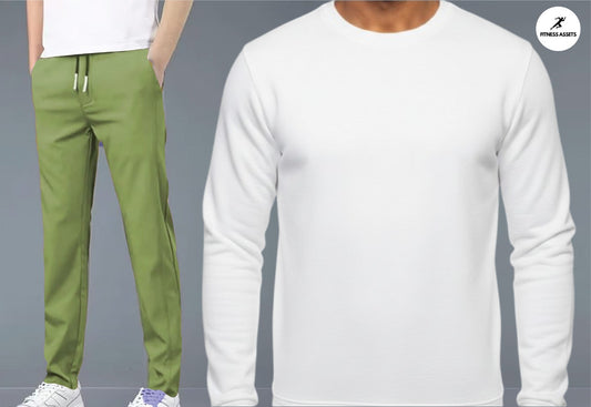4 WAY STRETCHABLE LYCRA PISTA GREEN TRACKPANTS AND FLEECE WHITE SWEATSHIRTS COMBO