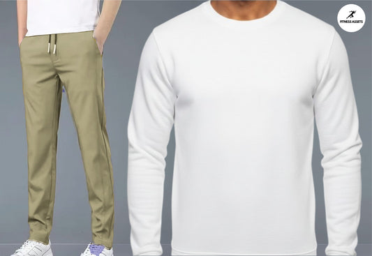 4 WAY STRETCHABLE LYCRA CAMEL TRACKPANTS AND FLEECE WHITE SWEATSHIRTS COMBO