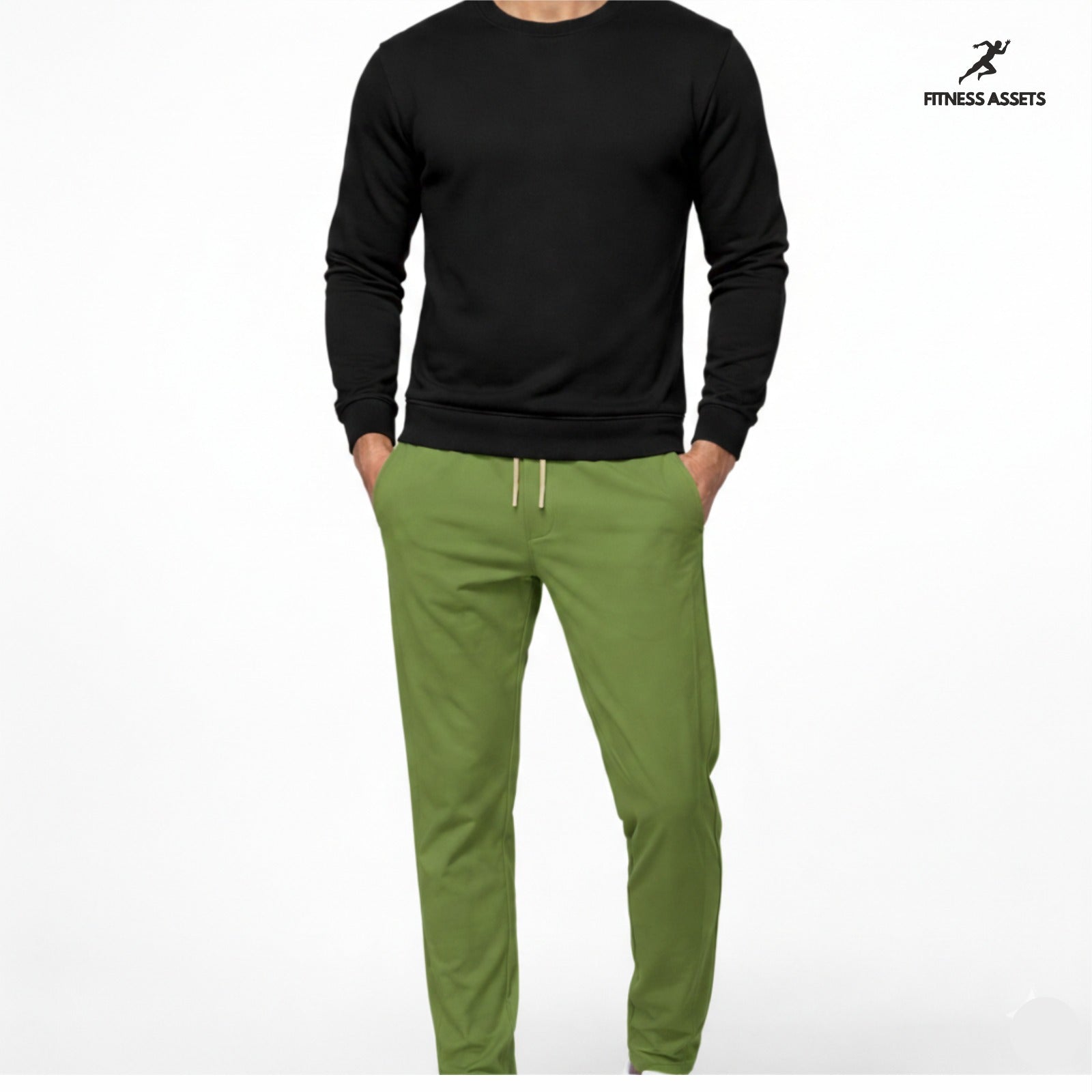 4 WAY STRETCHABLE LYCRA PISTA GREEN TRACKPANTS AND FLEECE BLACK SWEATSHIRTS COMBO